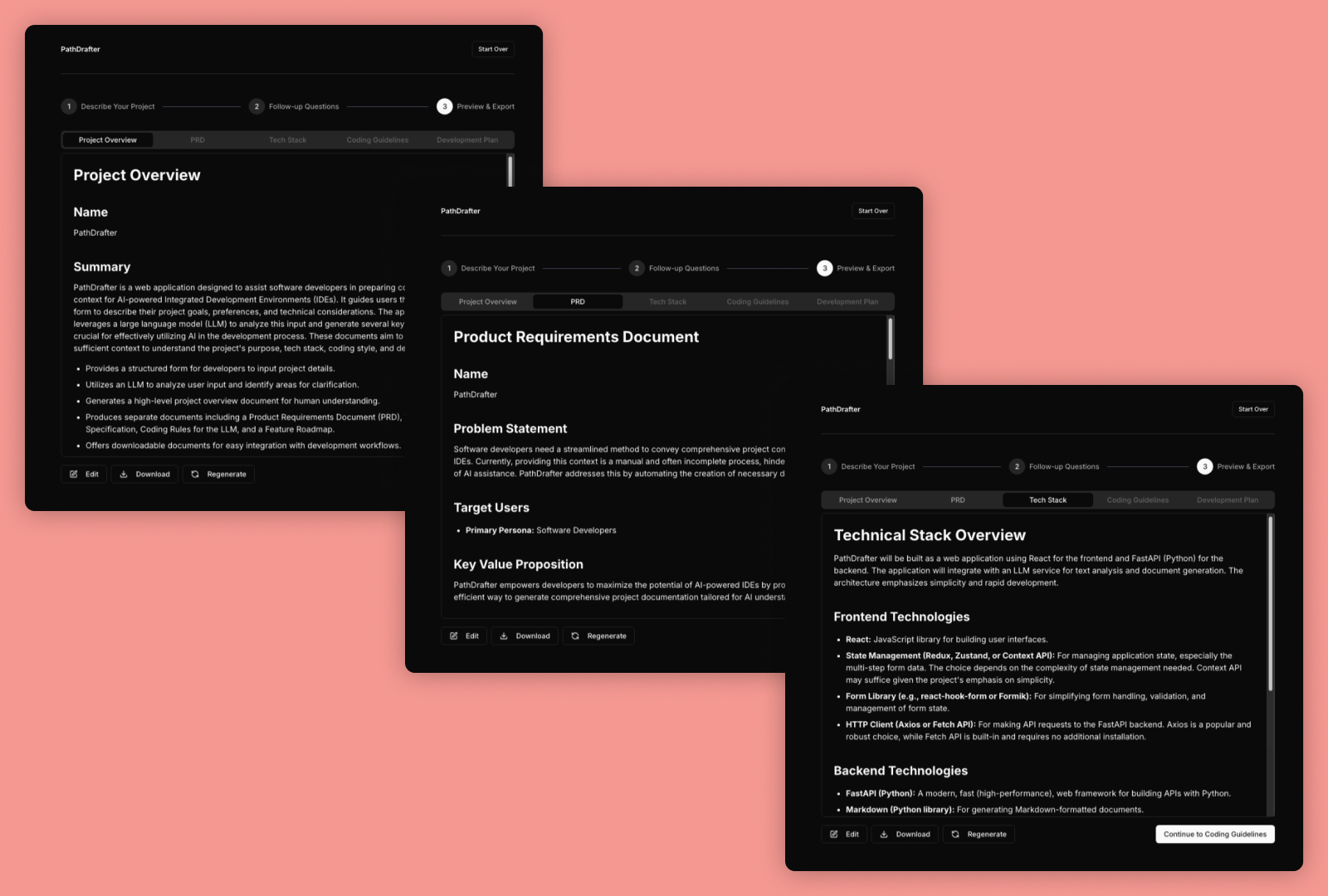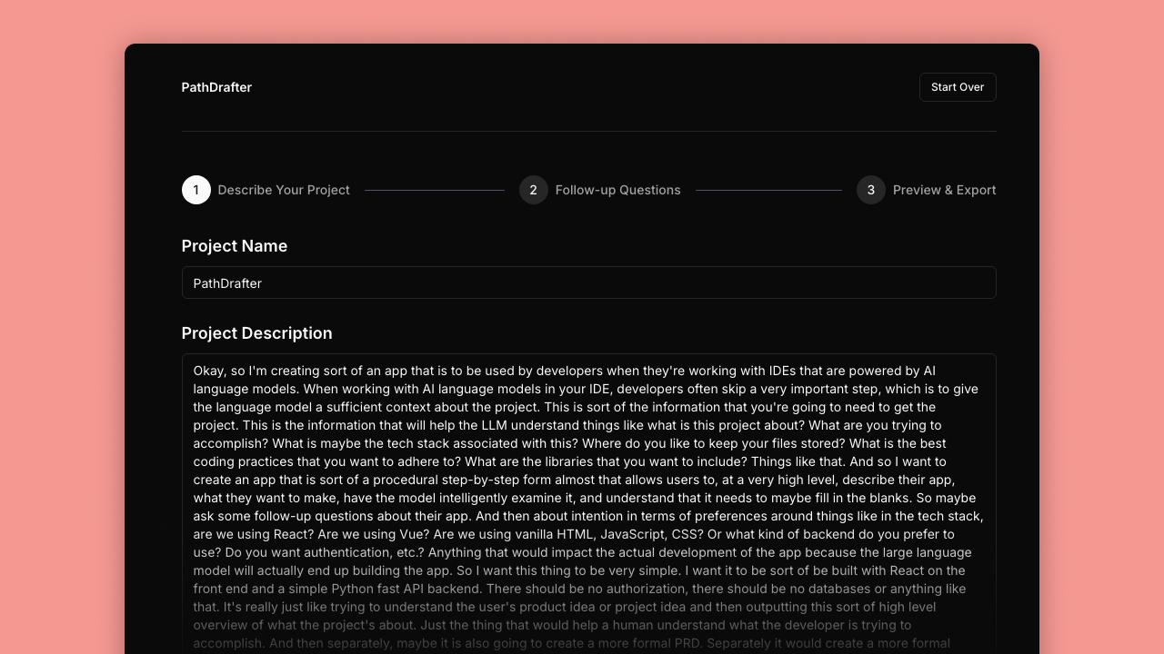PathDrafter transforms vague ideas into clear direction. Tell PathDrafter all about your vision, and the multi-step wizard asks targeted follow-up questions, followed by generating comprehensive documentation including project overviews, tech specifications, and coding guidelines—all designed to be fed directly back into your AI-powered IDE. You make edits along the way, each document informing the next.