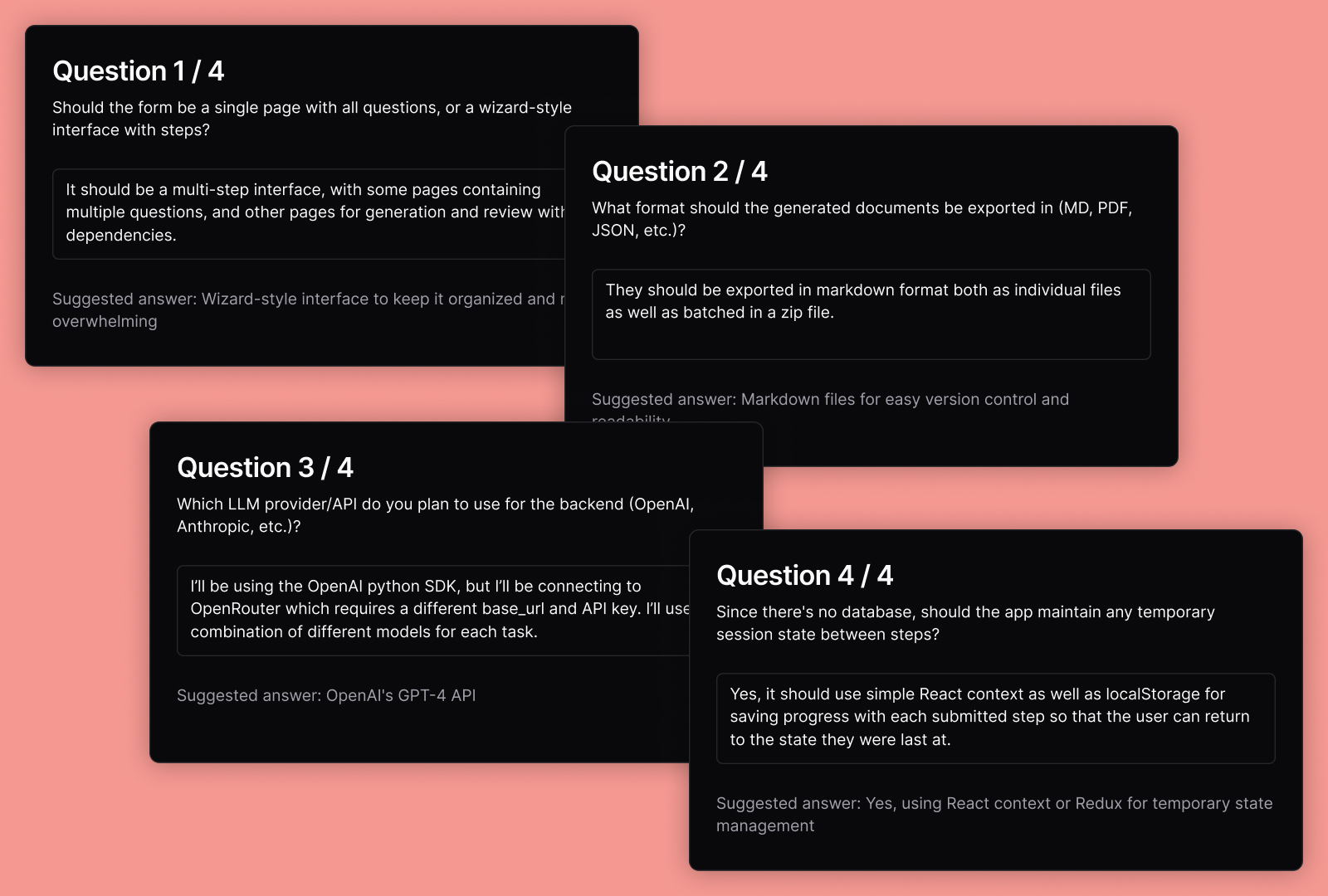 The most surprising discovery? The "friction" of answering questions about your project isn't a bug—it's the feature. These moments of reflection force clearer thinking and surface crucial decisions we might otherwise skip. It keeps you in the loop, rather than making assumptions and fully automating its output. For entire product teams, this structured approach creates a shared foundation that dramatically reduces miscommunication and rework, letting everyone (human and AI alike) focus on building rather than explaining.