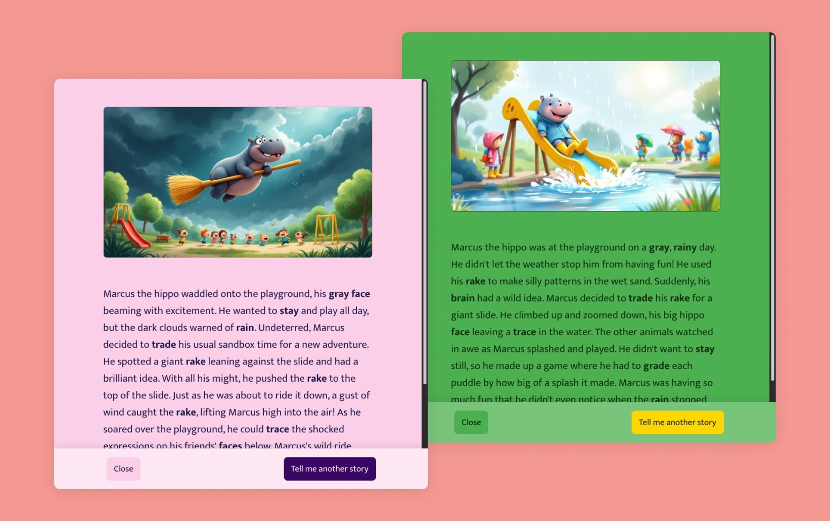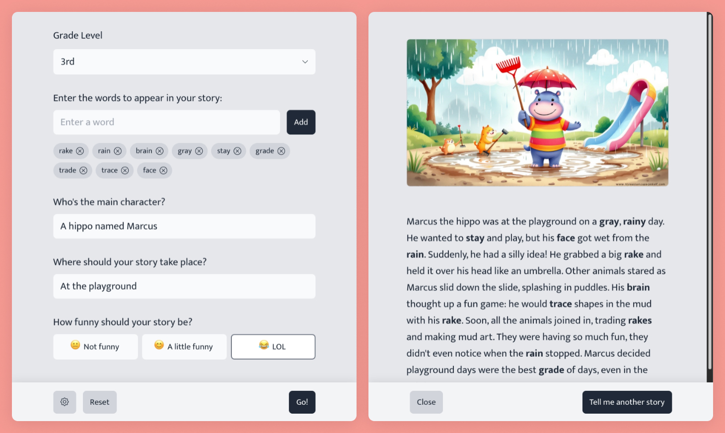 What if homework felt less like work and more like adventure? I believed generative AI could breathe life into reading practice by crafting personalized, playful stories that incorporate kids' spelling words. By giving children creative control over characters, settings, and humor levels, we could transform reading practice into a genuinely enjoyable, imagination-driven activity.